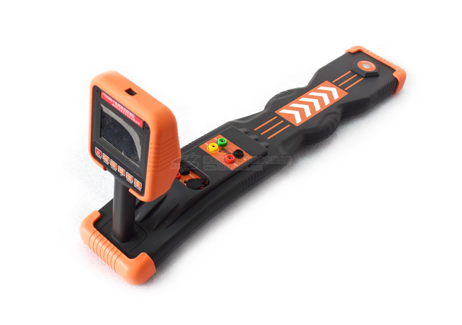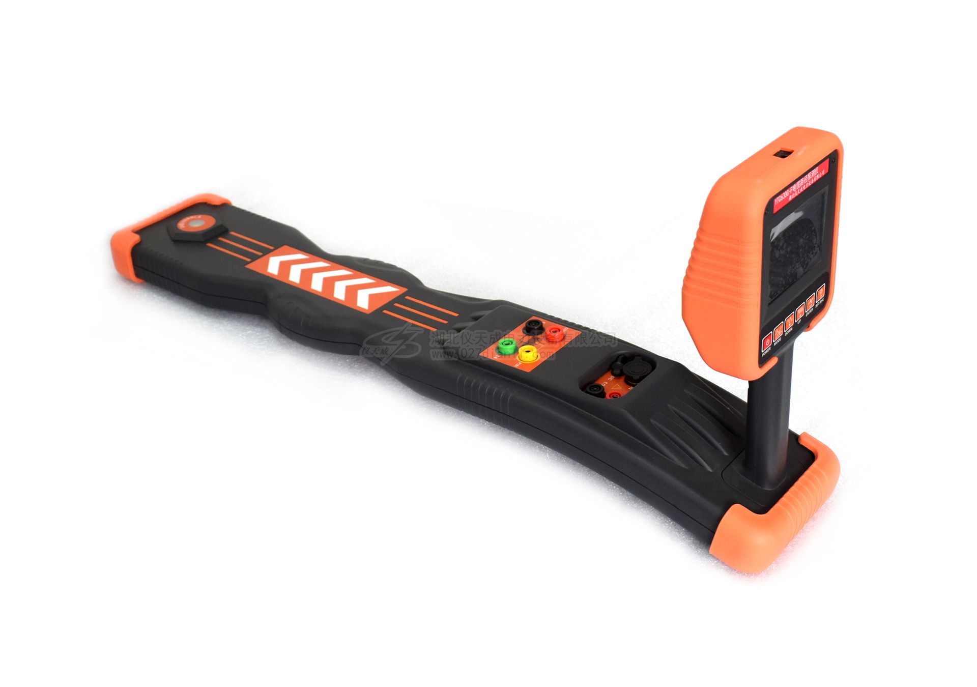9. 接地故障查找(選配功能):發(fā)射機(jī)發(fā)射定位信號(hào)至故障線纜,使用A字架(選配件)可定位管線的接地故障定位點(diǎn),箭頭指示定位方向。